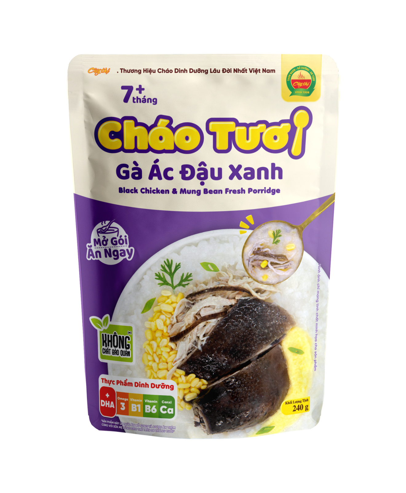 Nước hầm xương (nước, xương cá hồi), gạo tấm (10%), thịt gà ác (7%), đậu xanh (2%), dầu thực vật, muối, đường, hương liệu (tổng hợp), Calcium carbonate, Vitamin B1 (Thiamine Mononitrate), Vitamin B6 (Pyridoxine Hydrochloride), Folic Acid (N - Pteroyl - L - glutamic Acid), chất xơ hòa tan dạng FOS (0.2%), DHA (Docosahexaenoic Acid) 0.025%.