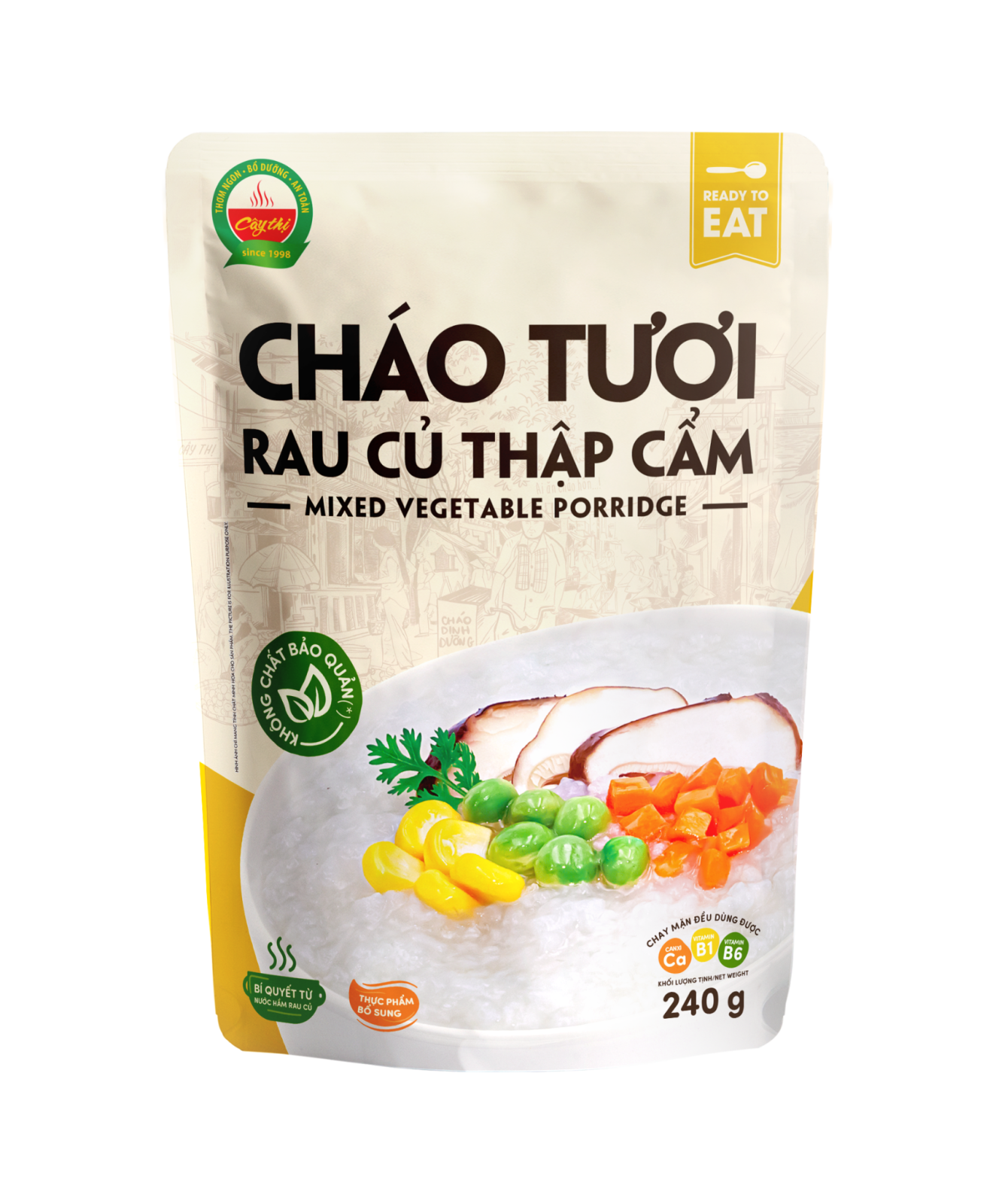 Cháo tươi rau củ thập cẩm chế biến từ các loại hạt giàu dinh dưỡng là đậu hà lan, đậu xanh, bắp kèm theo cà rốt và nấm đông cô… có hàm lượng chất béo thấp, giàu chất xơ có lợi cho hệ tiêu hóa. Các loại rau củ có hàm lượng muối thấp, thích hợp với người có bệnh cao huyết áp hoặc tim mạch.