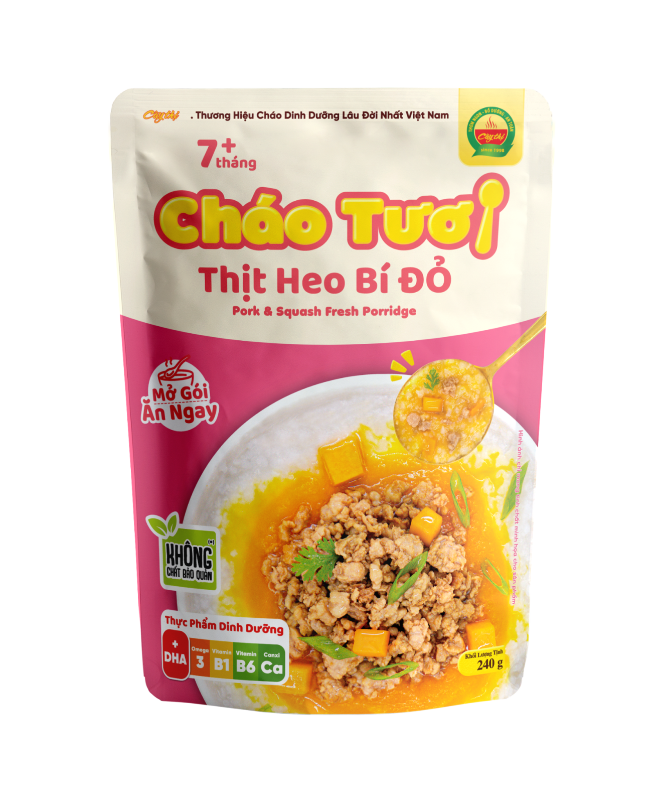 Nước xương hầm ( nước, xương cá hồi), gạo tấm (10%), thịt heo (7%), bí đỏ (2%), dầu thực vật, hành lá, muối, đường, hương liệu (tổng hợp), Calcium carbonate, Vitamin B1 (Thiaminchloride hydrochloride), Vitamin B6 (Pyridoxine hydrochloride), Folic Acid (N-Preroyl-L-glutamic Acid), chất xơ hòa tan dạng FOS (0.2%), DHA (Docosahexaenoic Acid) (0.025%) |
