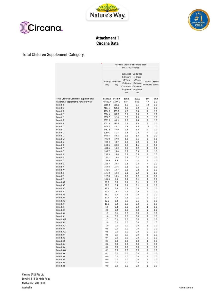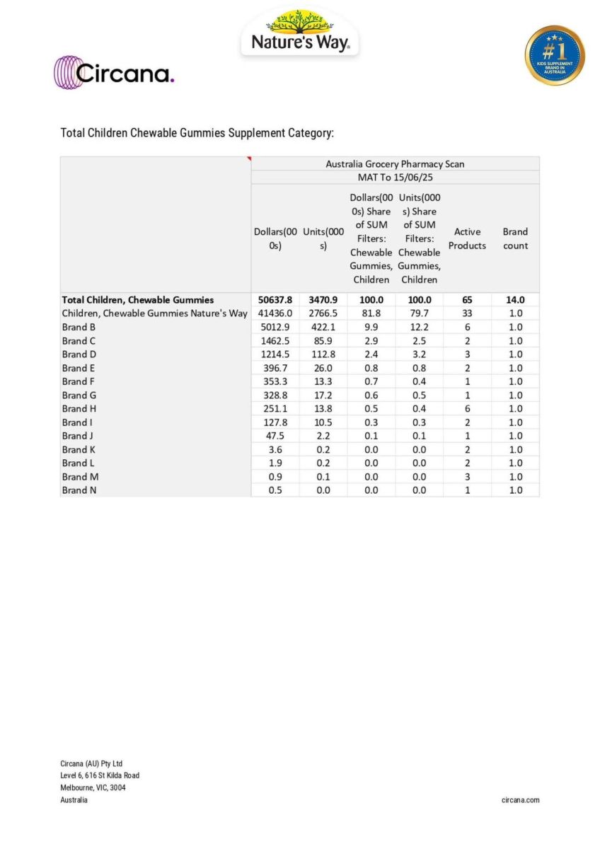 Nguồn: Circana (AU) Pty Ltd, MarketEdge, hệ thống nhà thuốc và siêu thị tại Úc, Natural Health, Thực phẩm bổ sung cho trẻ em, doanh số (AUD), sản lượng & thị phần giá trị, MAT tính đến 15/06/2025.