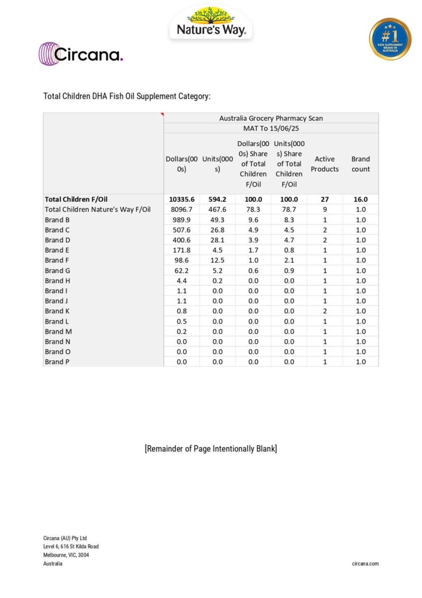 Nguồn: Circana (AU) Pty Ltd, MarketEdge, hệ thống nhà thuốc và siêu thị tại Úc, Natural Health, Thực phẩm bổ sung cho trẻ em, DHA Fish Oil, doanh số (AUD), sản lượng & thị phần giá trị, MAT tính đến 15/06/2025.