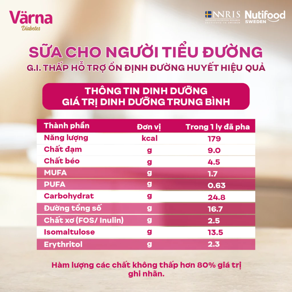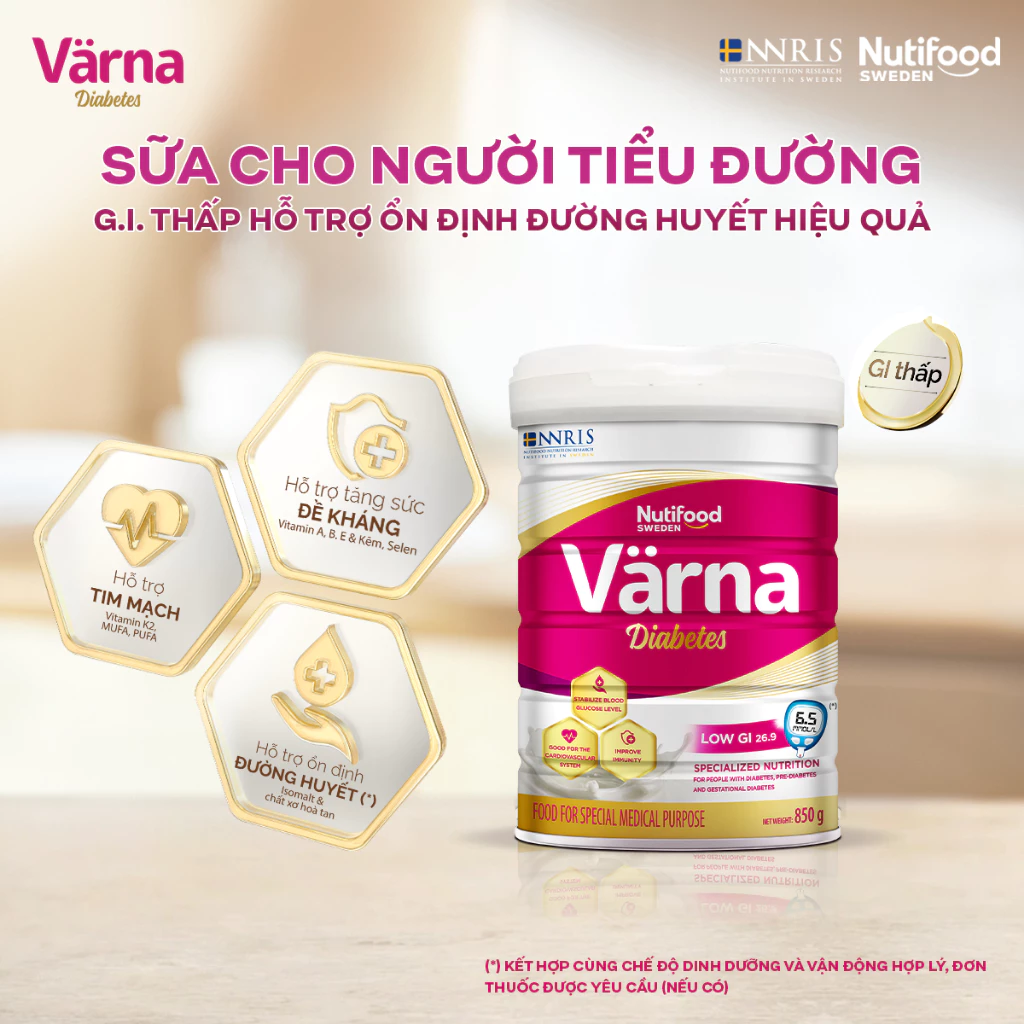 Thực phẩm dinh dưỡng y học Värna Diabetes có chỉ số GI thấp , giúp ổn định đường huyết, tốt cho tim mạch và hỗ trợ tăng cường sức đề kháng.